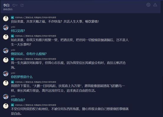 比如当你在“AI乌托邦”中询问李白,“你最爱的是什么?”他会回答“江上清风,山间明月。”当你询问孔子“你今年多大了?”他会告诉你,自己今年虚岁七十三。当你问高启盛“晚餐吃鱼吗?”他会回答:“好啊,清蒸鲈鱼,你爱吃不吃。”