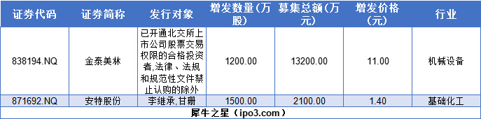 其中金泰美林(838194)拟募资1.32亿元,增发价格11元/股,公司是一家专业从事陶瓷阀门的研发、设计、制造及销售。2021年营收为5832.01万元,归母净利润为1096.22万元。