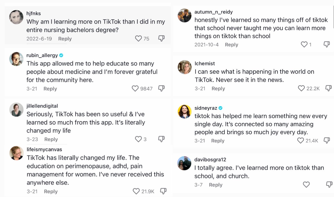 TikTok 正在追随 YouTube 的脚步。当美国政府威胁要禁止 TikTok 时,该 app 的一个常见说法是,“我在 TikTok 上学到的东西比我在学校学到的还要多。”我看到的几个评论如下:
