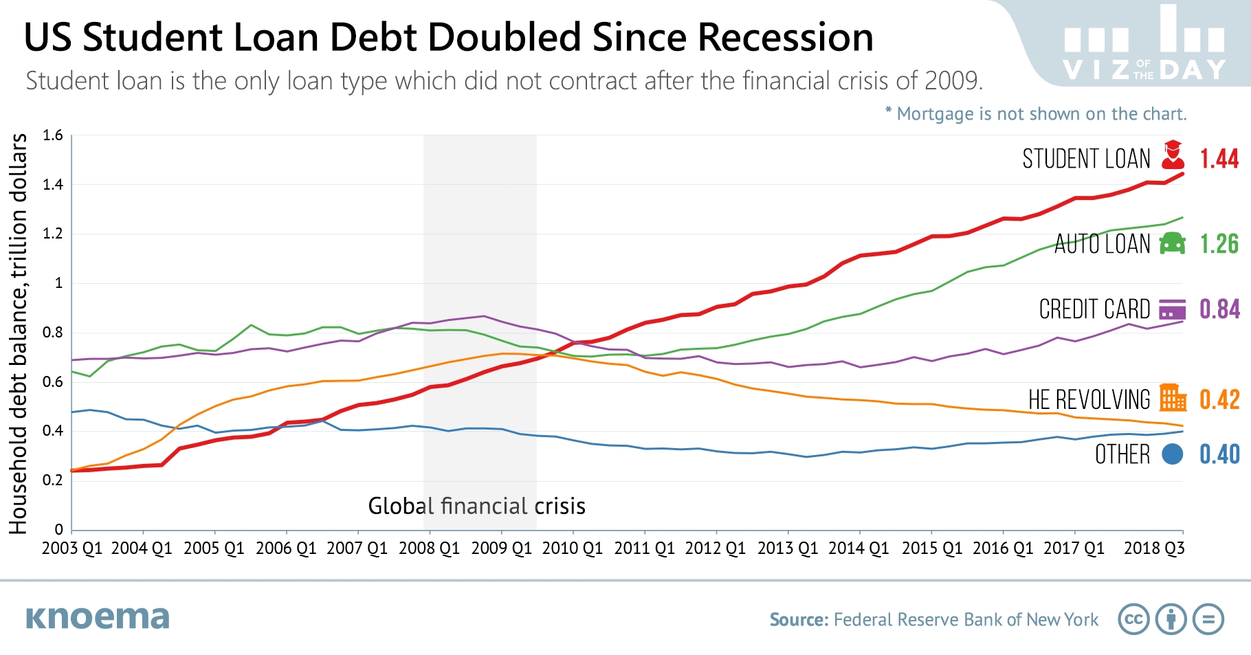 对很多人来说,上大学根本就负担不起。助学贷款债务出现激增,从 2008 年到 2018 年翻了一番,达到约 1.5 万亿美元。