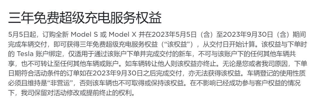 除了上调价格,特斯拉还宣布,5月5日起,订购全新Model S或Model X并在2023年5月5日(含)至2023年9月30日(含)期间完成车辆交付,即可获得3年免费超级充电服务权益。