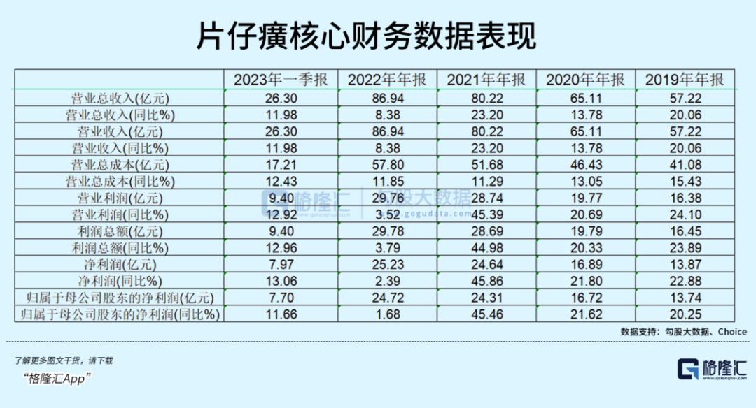 2022年,片仔癀营收为86.94亿元,同比增长8.38%,归母净利润为24.72亿元,同比仅增长1.68%。营收和利润增速均创下2015年以来最低,且首次低于10%。今年一季度,营收26.3亿元,同比增11.98%,归母净利润为7.7亿元,同比增11.66%。相较于过去几个季度环比改善明显,但绝对增速并不算太快。