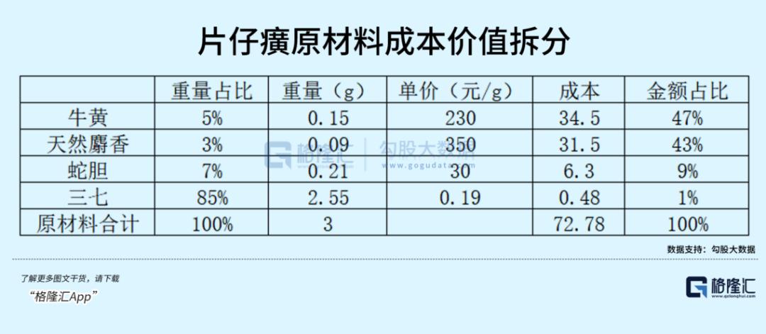 天然麝香和牛黄一共占原材料的比重达到了90%。一锭3g的片仔癀的四项原材料成本合计为73元/g,占比约为18%,其中天然麝香成本为31元/锭,占原材料的比重为43%,牛黄的成本约为34.5元/g,占原材料的比重为47%。