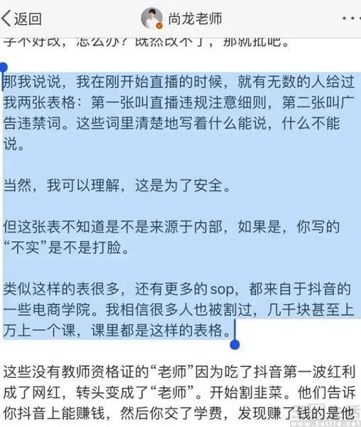 看到这里,一个诡异的事实就浮出水面了,那就是几乎等同于官方开的店铺,都会不自觉地使用变体来进行表达。然而在去年夏季就曾有博主发文称,“抖音屏蔽很多关键词,导致谐音梗流行”,诸如“秒杀”、“赚钱”、“直播间”等词都不能说,只有换成谐音词“秒秒”、“赚米”、“啵啵间”等,才不会被提示违规。而当时抖音方面可是言之凿凿的回应称,正常使用表达不会被审核、处罚,仅在被用作传播色情低俗、违规引流交易、虚假宣传等违法违规行为才会加以管理。