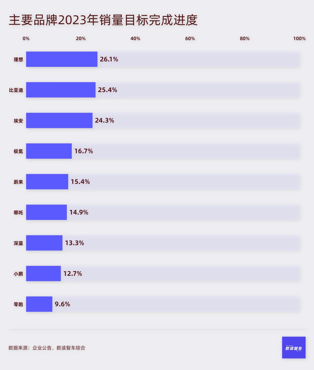 细分来看,理想、比亚迪、埃安是进展顺利的车企,分别完成了26.1%、25.4%和24.3%,考虑到下半年消费市场还会进一步恢复,依然很有希望完成目标。其中,理想无疑是信号最积极的新势力,虽然定的目标是新势力车企中最高的,但却是最有可能完成预期目标的车企。