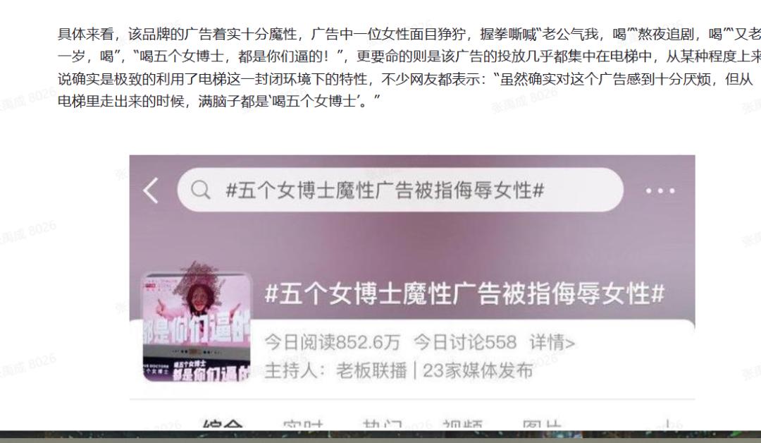 具体来看,该品牌的广告着实十分魔性,广告中一位女性面目狰狞,握拳嘶喊“老公气我,喝”“熬夜追剧,喝”“又老一岁,喝”,“喝五个女博士,都是你们逼的!”,更要命的则是该广告的投放几乎都集中在电梯中,从某种程度上来说确实是极致的利用了电梯这一封闭环境下的特性,不少网友都表示:“虽然确实对这个广告感到十分厌烦,但从电梯里走出来的时候,满脑子都是‘喝五个女博士’。”