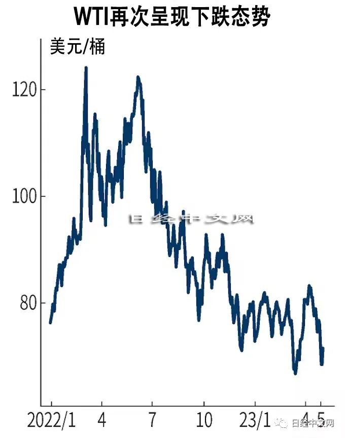 美国原油指标WTI(西德克萨斯中质油)在5月4日的盘前盘后交易中一度跌至每桶63美元左右,创出自2021年12月以来、1年零5个月的新低。截至上周末,价格略微回升至71美元左右,但仍处于年初以来的最低点,自2022年11月以来首次连续3周下跌。