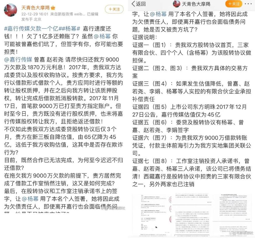 2022年12月底,微博网友@天青色大摩羯在微博晒出相关合同,表示嘉行曾在2017年与其所在公司达成委贷及股权收购协议,但嘉行拿了钱之后却没有履行后续合同,现要求嘉行返还当时借款9000万及利息1870万,总计超一亿。