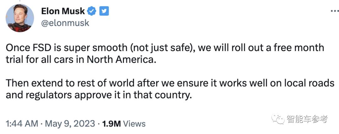 一旦FSD体验足够丝滑(不仅是安全)后,我们计划在北美给所有车主开放一个月免费试用。在确保全球其他地区功能正常并且法规允许后,我们也会推动FSD的用户免费试用。