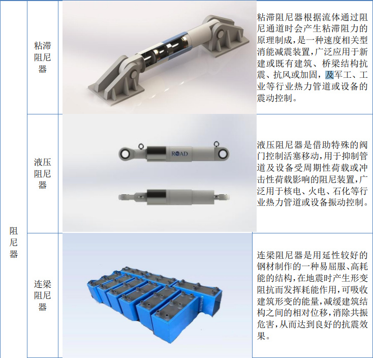公司主要产品为粘滞阻尼器、液压阻尼器、连梁阻尼器、调谐质量阻尼器、屈曲约束支撑及抗震支吊架等各类减震产品,产品广泛用于建筑桥梁、工业、军工等多个领域。