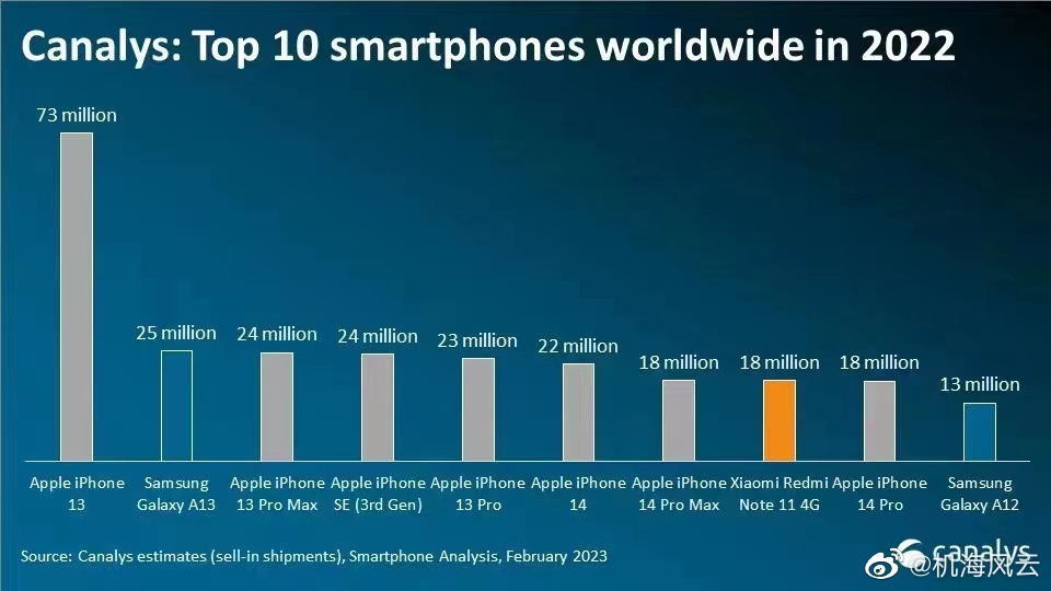 Canalys统计的2022年全球畅销智能手机TOP 10排行榜中,iPhone独霸7席,并且款款均是高端机,三星靠A12和A13两款低端机上榜,国产手机品牌中,仅有红米Note 11 4G版榜上有名,且销量仅有iPhone 13的不到1/4,但这已经创造了国产的高光奇迹!