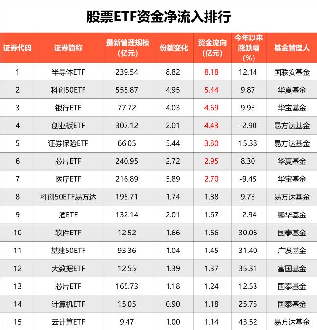 银行、证券保险ETF净买入,创业板ETF龙头今年净买入超100亿