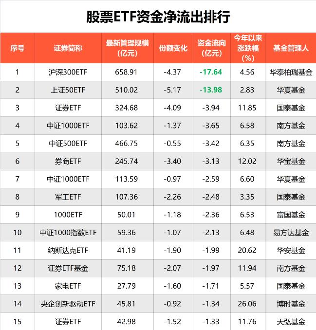 从宽基指数看,沪深300ETF当日净流出近18亿元,上证50ETF也有近14亿元的净卖出。同时,中证1000ETF、中证500ETF等大盘宽基指数也有不同程度的资金流出。