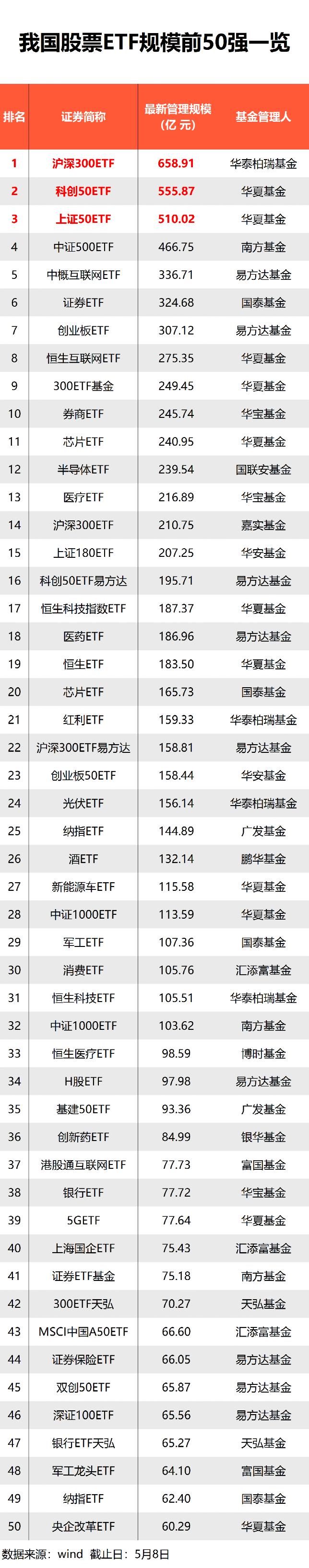 目前的市场格局中,沪深300ETF规模659亿元,高居股票ETF规模首位,科创50ETF、上证50ETF同期规模超500亿元。行业和主题ETF中,已经诞生中概互联网ETF、证券ETF两只超300亿体量的基金。半导体ETF、医药ETF、游戏ETF等规模增长势头也非常迅猛。