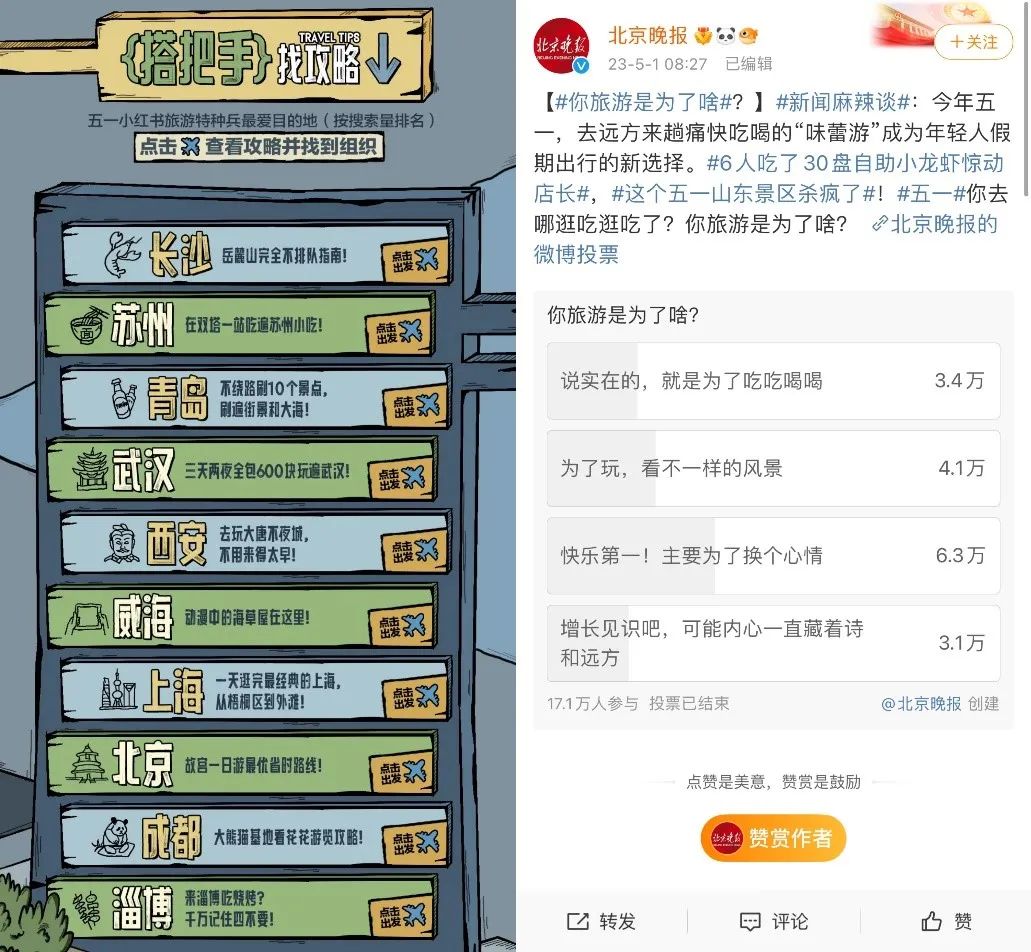 “北京晚报”在五一节期间曾发起关于“你旅游是为了啥”投票,有17.1万人参与。其中,“快乐第一!主要为了换个心情”以6.3万票排名第一、“为了玩,看不一样的风景”以4.1万票排在第二、“说实在的,就是为了吃吃喝喝”以3.4万票排在第三、“增长见识吧,可能内心一直藏着诗和远方”以3.1万票排在最后。