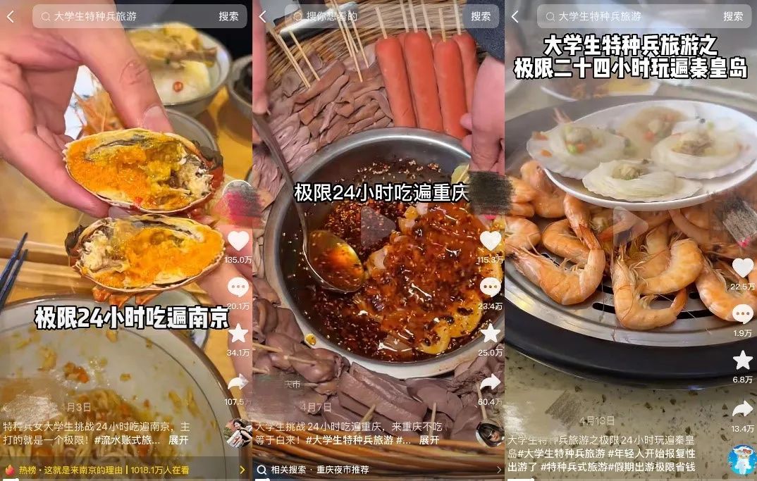 的确,锌刻度也发现,“旅游特种兵”这股风,许多自媒体都在绞尽脑汁地蹭,即便是已经有了稳定模板的博主也会借“旅游特种兵”这股话题重新打开流量池。