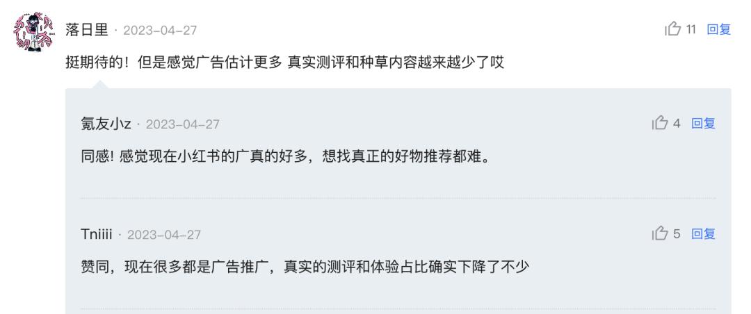 从用户评论来看,越来越多的“小红薯”们发现他们所依赖的“红薯地”正在被铺天盖地的广告和虚假宣传“啃食”。真实测评越来越少,好物推荐真假难辨,软广暗广正不断加重用户的戒备心理,非常伤害用户体验。