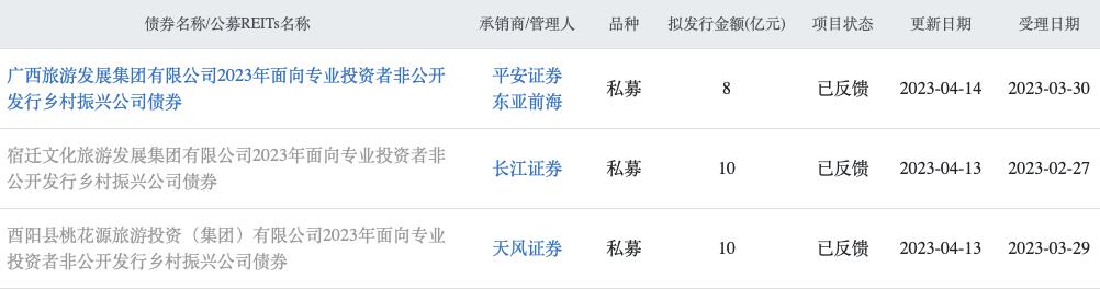 对比2023年前4个月,上交所审核通过的同类主体(滨海县农旅集团、仪征市扬子文旅控股集团)发行的乡村振兴公司债已达3只,拟发行金额合计17.59亿元;此外,有3家地方文旅国企(广西旅发集团、宿迁文旅集团和西阳桃花源旅投集团)发行的3只乡村振兴公司债券,项目状态均于4月更新为“已反馈”,拟发行金额合计为28亿元。