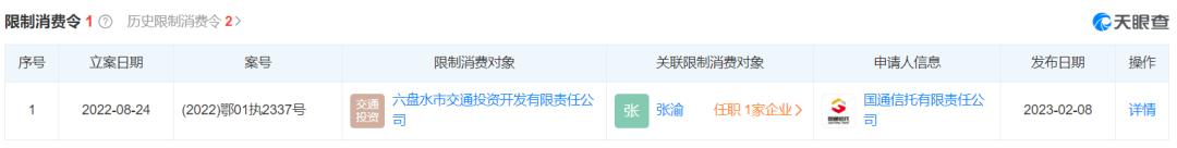 另需留意的是,为21六旅01和21六旅02两只债券提供无条件不可撤销连带责任保证担保的六盘水市交通投资开发有限责任公司,此前曾有多条历史限制高消费记录,而因拒不履行案号为(2022)鄂01执2337号的判决(未履行金额为9000万元),公司于2023年2月8日再遭限消。