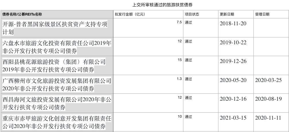 聚焦旅游扶贫债/旅游扶贫资产支持证券,该类创新产品从面世到完成使命(国家级贫困县全部摘帽),上交所审核通过的相关债券共6只,拟发行金额合计57.8亿元,涉及云南普者黑文旅开发公司、六盘水市旅文投资公司、西阳县桃花源旅投集团、柳州文旅投集团、西昌海河文旅投资公司和重庆市赤甲旅文创意开发集团。
