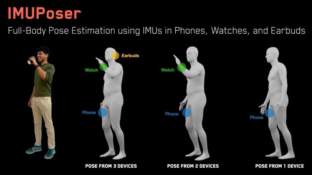 而手机、手表、耳机可为全身姿态追踪提供足够数据,包括四肢的位置,以及站立、蹲坐等状态。另外,可通过距离传感器识别手机在口袋内部还是外部。还能根据智能手表和手机之间的距离(基于UWB定位),来识别手机在哪个口袋、哪只手上。