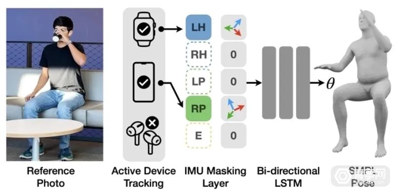 IMUPoser方案的一大重点,是将从手机、智能手表等设备收集(本文用苹果生态,结合 iPhone、以及可选搭配Airpods、Apple Watch,并用MacBook进行数据回流)的数据整合,并计算出用户的全身姿态。其使用的算法基于定制的双向LSTM模型(长短记忆模型),输出SMPL动捕模型。
