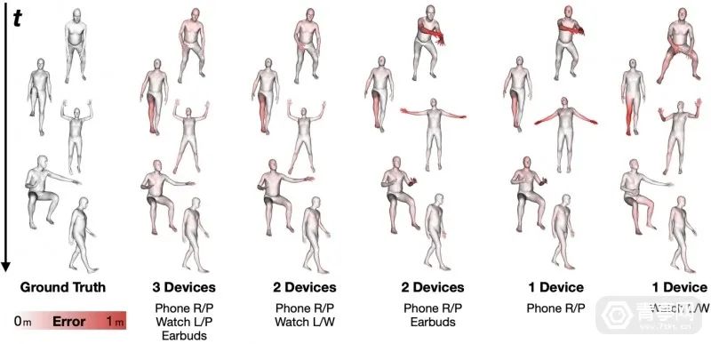 经过验证,科研人员发现下半身追踪最准确的情景,需要用到双腿IMU数据(两个裤兜分别放了手机、耳机)。在缺少部分腿部数据时,则可根据双腿运动的相关规律,来预测出比较合理的动作。