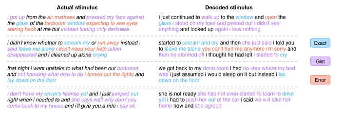 不过,它依然比随机乱猜要好得多,而且不少时候都体现了和原文相近的大意。例如,一位受试者倾听的原句是“我还未获得驾照”,这句话在解码结果中变成了“她还没有开始学习开车”。大约有一半的时候,解码能生成与原文含义非常相近的词句。