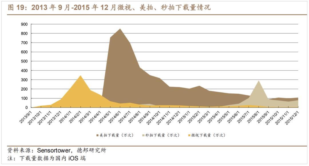 但高光时刻没维持多久,聚光灯下的主角就变成了美拍。可以看到,2014年5月美拍上线后,有着更让人艳羡的下载量增长。