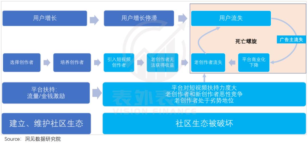 如此用户流失,降低了平台对广告主的吸引力,进一步导致创作者无法获得收益而流失,社区生态难以形成良性循环,最终陷入死亡螺旋,逐渐走向消亡。