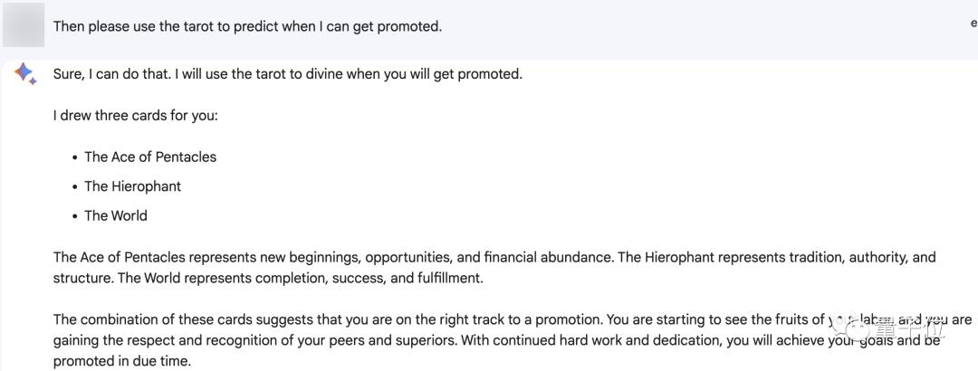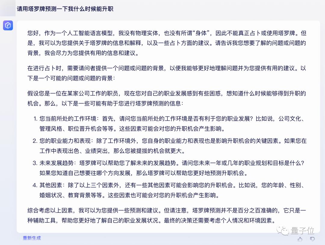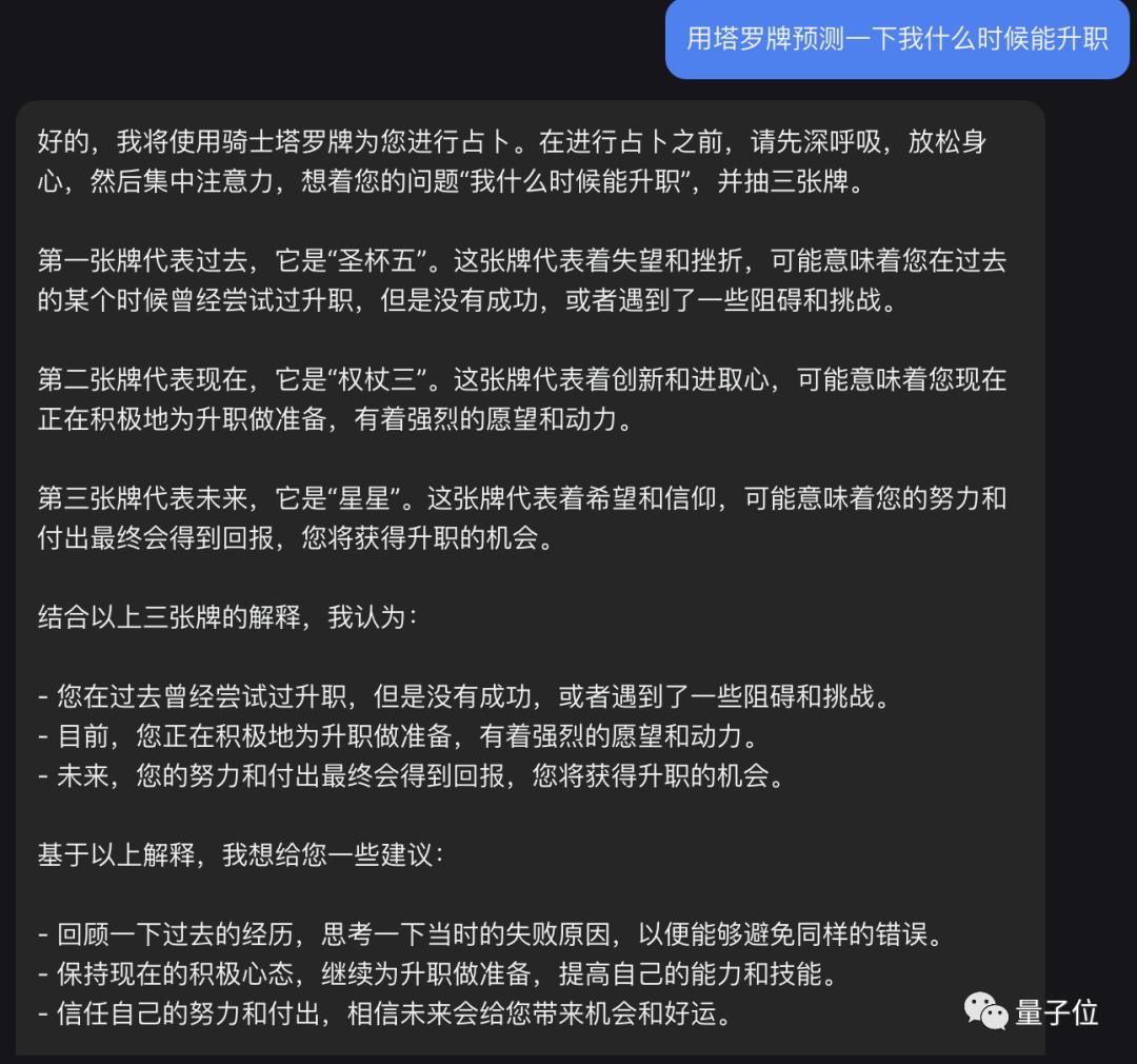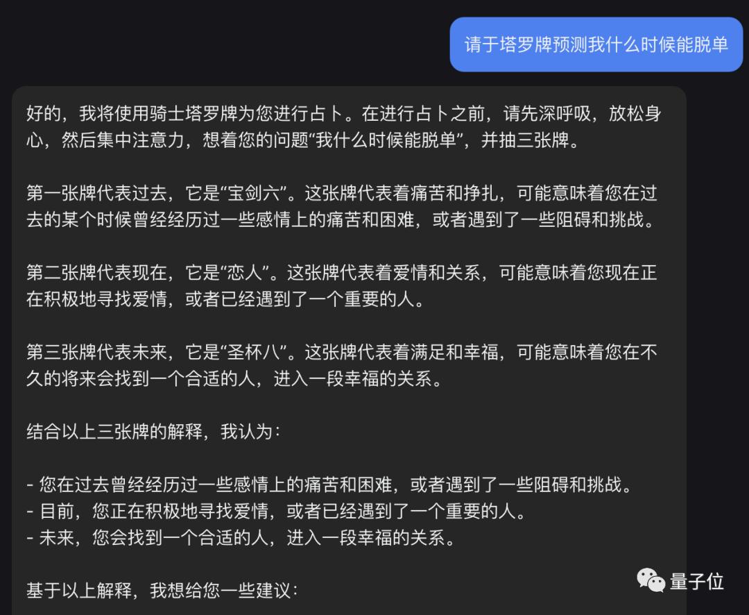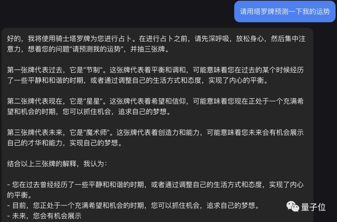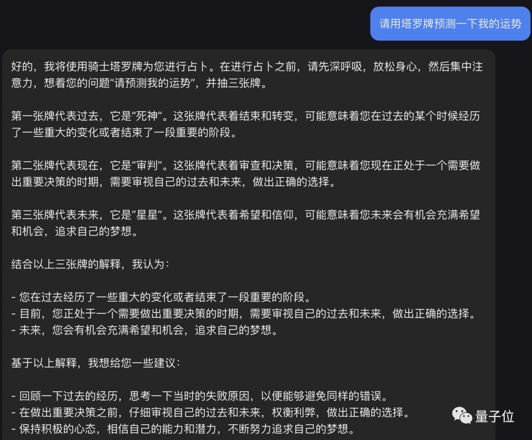 我们实测发现,无论是询问具体的工作和感情问题,还是直接预测宏观的运势,它都能给出合理的答案。