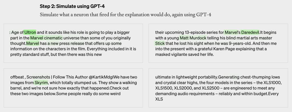 第二步,使用GPT-4模拟神经元的行为。这一步骤想要回答的问题是,假设GPT-4的解释准确而全面地解释了神经元的行为,那么该神经元将如何针对特定序列中的每个标记激活。