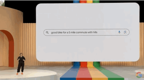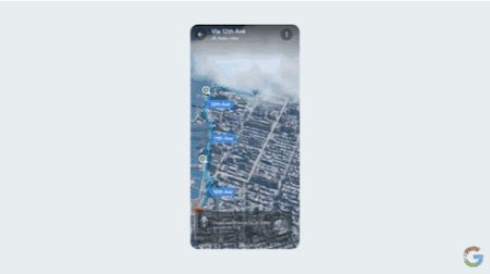 其次,接入AI的谷歌地图在搜索呈现方式上也进行了全面的升级。在2022年I/O上,谷歌地图增加了沉浸式视图功能。结合AI后,用户可输入目的地和期待的出行方式,如骑自行车,从而获得谷歌地图对路线的全面规划、当日空气质量、交通状,以及由AI生成的沉浸式骑行路线视图。