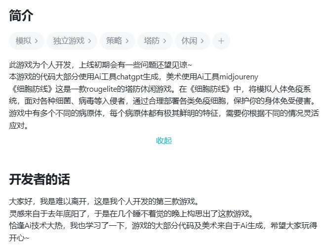 根据开发者「难以离开」的介绍,《细胞防线》使用unity引擎打造,其中的大部分程序都由ChatGPT生成,而美术方面的资源则都是交给了midjourney。