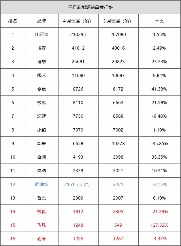 上图为各新能源主机厂在本月公布的4月销量成绩,其中排名靠后的三家(极狐、飞凡、创维)月销成绩均未过2000辆。