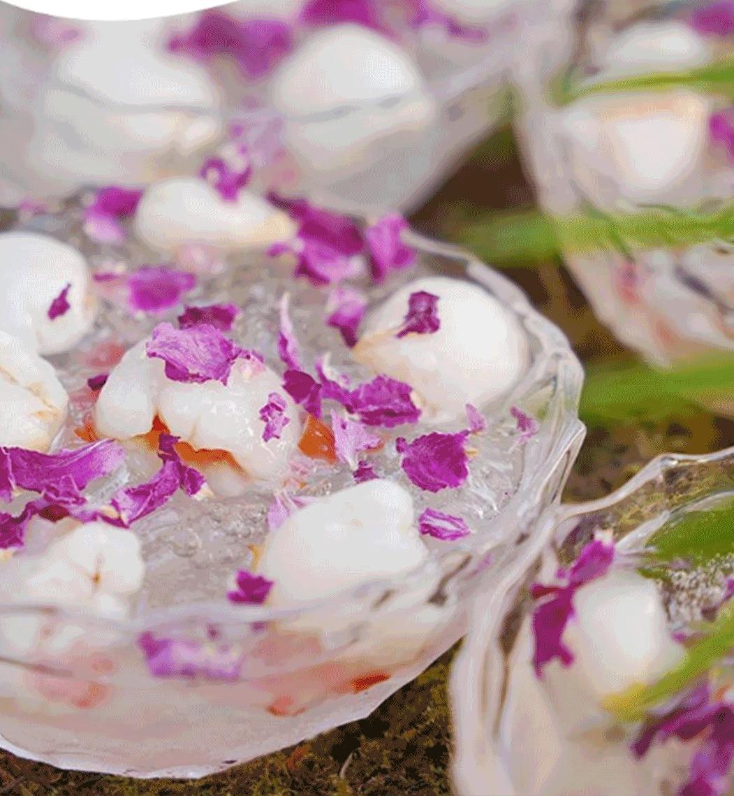 产品上也是十分治愈,如洒着小黄花的大牛排被摆在厚实的原木托盘上,竟莫名有种清新感;就连鳝鱼这样血腥的食材,搭配上紫苏之后也显得温顺可爱;火锅店当然少不了甜品啦,白白胖胖的荔枝躺在透明的冰粉里,撒上紫红色的玫瑰花碎,还没有吃就感受到了冰凉。