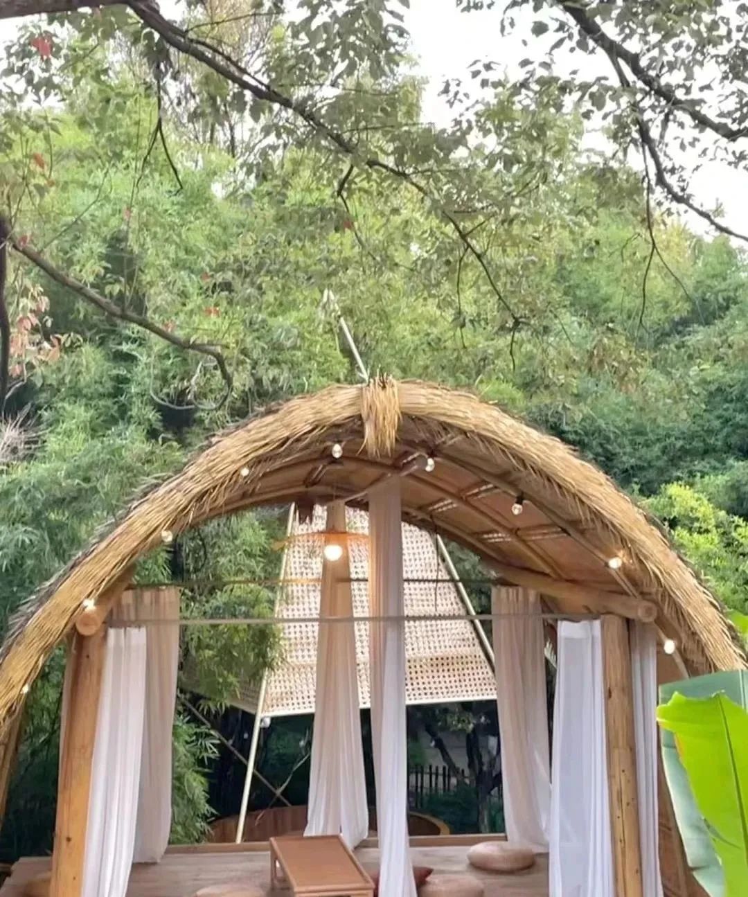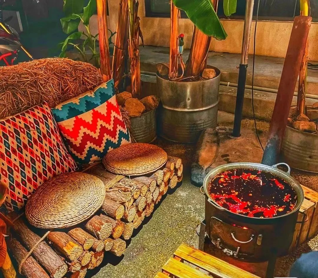 种满芭蕉树的绿色丛林里,撑起帐篷,坐在草垛沙发上,支上铁锅,煮一顿丰盛火锅,别有一番滋味。