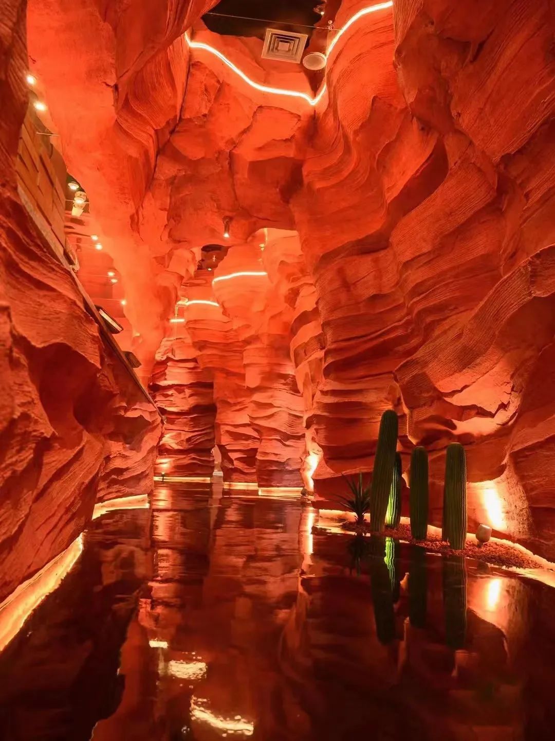 一进电梯,风蚀砂岩迎面而来,橘红色的岩石被风打磨出一道道丝滑的线条,在灯光的映射下,层次感十足,大气沉稳又带着沙漠气息,站在狭长的通道里,随手一拍都是美国大片。