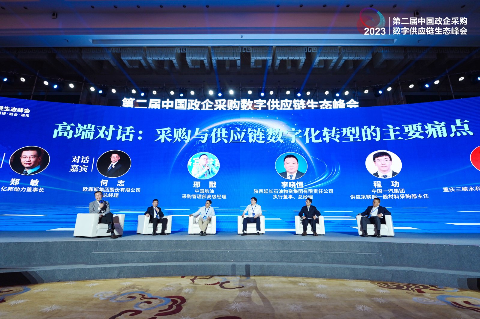 伴随数字技术的快速扩散应用,数字供应链已成为政企采购发展的必然方向。高端对话环节,亿邦动力董事长郑敏担任主持嘉宾,与欧菲斯集团股份有限公司总经理何志,中国航油采购管理部高级经理邢戬,陕西延长石油物资集团有限责任公司执行董事、总经理李晓恒,中国一汽集团供应采购部一般材料采购部主任程功,重庆三峡水利电力(集团)股份有限公司招采中心主任钟建华5位对话嘉宾,就“采购与供应链数字化转型的主要痛点”展开了探讨。