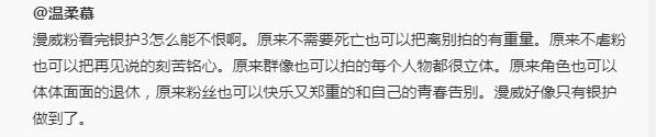许多观众在看完这部电影后,联想起了2019年的《复仇者联盟4》,认为《银河护卫队3》不以牺牲为终章的呈现方式,在情感上更能让人接受。