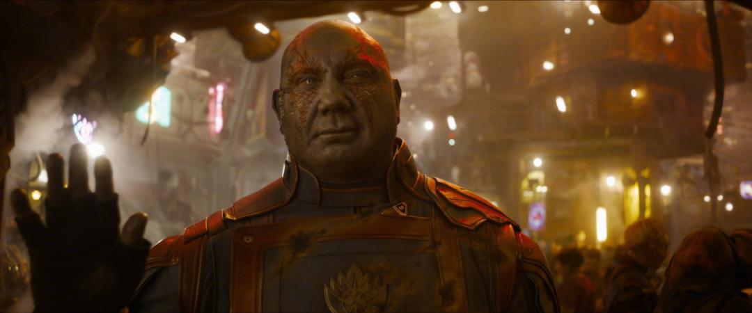 “铁憨憨”德拉克斯,家人被罗南杀害,一直在用坚硬隐藏柔软的一面。(图/《银河护卫队3》)