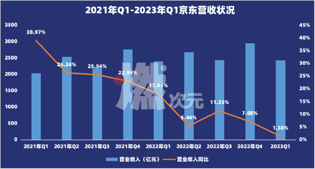 在2020年和2021年这两年疫情管控大背景下,京东年营收增速分别为29.28%和27.59%,2022年京东的营收增速掉了大半,仅为9.95%,不曾想,2023年一季度同比增速更是直接掉至1.38%,下滑的迹象十分明显。