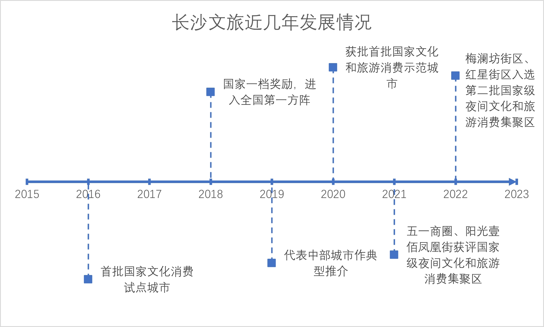 2016年,长沙市获评首批国家文化消费试点城市,2018年,长沙文化消费试点获评国家一档奖励,进入全国第一方阵,2019年在全国文化和旅游消费工作推进会暨文化和旅游工作培训班上,长沙代表中部城市在会上作典型推介,2020年,长沙市获批首批国家文化和旅游消费示范城市,文旅消费不断焕发新活力。