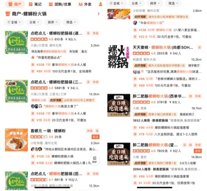 像是职餐记者所在的北京地区,有开出5家店的点吧点儿·螺蛳粉肥肠锅,不仅很火,评分也很高,还有开出3家门店的醉二肥肠螺蛳粉火锅,除此之外,还有很多螺蛳粉火锅品牌小店。
