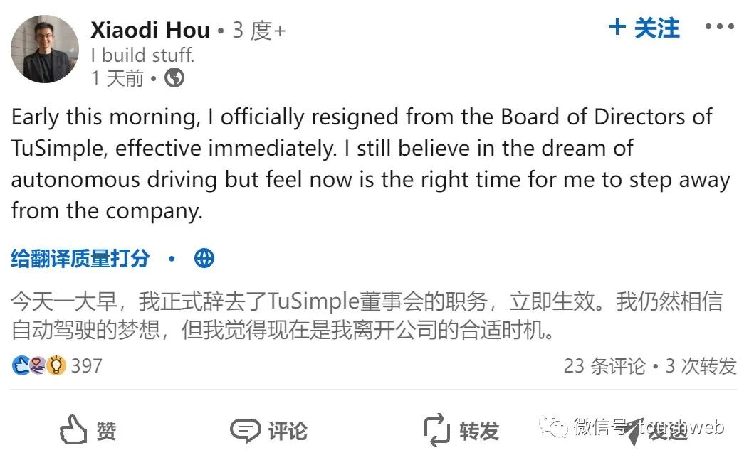 2023年3月,侯晓迪也宣布离职。侯晓迪在领英上宣布:“今天一大早,我正式辞去了TuSimple董事会的职务,立即生效。我仍然相信自动驾驶的梦想,但我觉得现在是我离开公司的合适时机。”