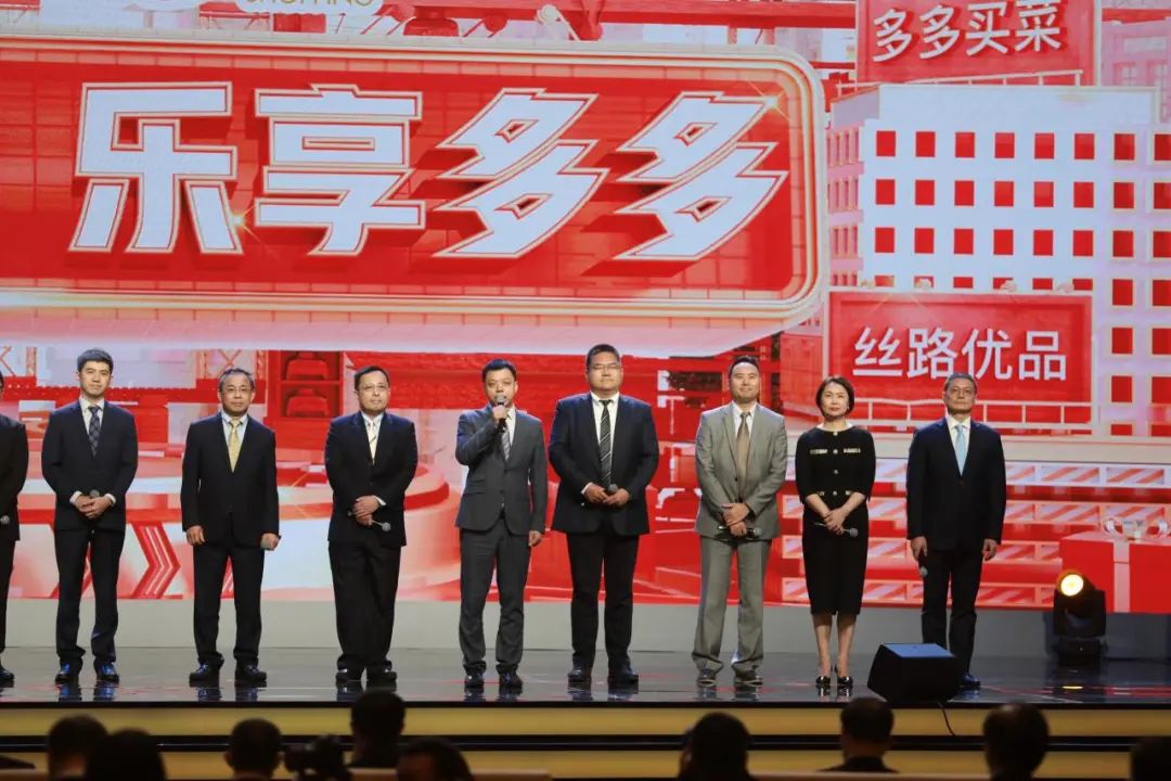 拼多多联席 CEO赵佳臻(左四)在启动仪式上表示,平台将投入40亿元消费补贴。 联合中央广播电视总台、东方卫视开展直播促消费活动,同时设立上海购物专区。赵歌 摄
