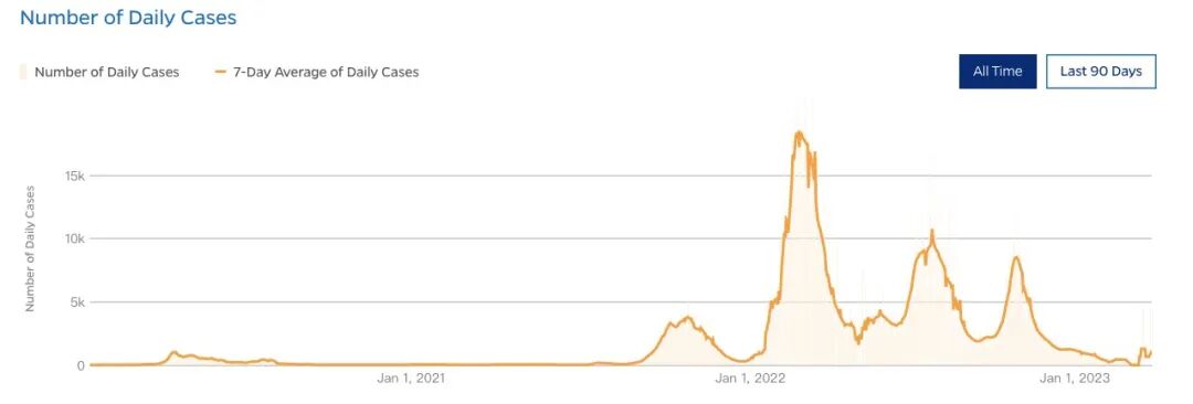 新加坡在2021年年底放开,经历了德尔塔毒株的冲击。随后,在2022年2月,迎来奥密克戎毒株第一波冲击的最高峰。随后两次高峰,分别在2022年7月和10月。