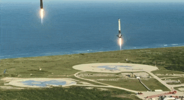 SpaceX 火箭起飞和降落的视频你可能已经看过了。提醒一下,这张动图反映的是 2019 年两个猎鹰火箭助推器同时回收着陆的情况(之后会被重新用于另一次发射)。很疯狂吧?