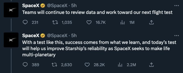 这次 Starship 试射完之后,Twitter 上对此次发射是成功还是失败出现了明显的分歧。SpaceX 推特账户发布的三条推文可以解释不同的反应。