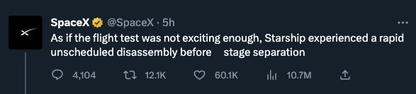 许多媒体机构在梳理整个故事线索上都十分吃力,大多认为此次发射是失败的。我承认,“计划外地快速拆卸”的说法十分有趣。不过,Starship 此次以及将来的试飞的关键在接下来的两条推文中已得到体现。